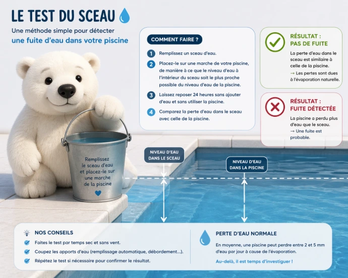 Un test simple consiste à comparer la perte d’eau de votre piscine avec celle d’un récipient rempli d’eau placé à côté (test du seau). Si la piscine perd plus d’eau que le récipient, il est probable qu’il y ait une fuite.